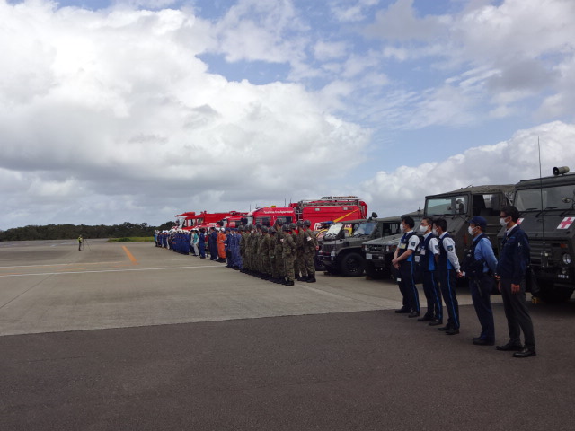 10月5日に対馬空港において令和4年度の消火救難訓練を実施しました。空港関係機関、対馬市消防署、陸上自衛隊対馬警備隊等から約110人が参加し、航空機事故発生時における通報の初動体制・情報伝達・消火、救出、救助活動における連携などの確認を行いました。