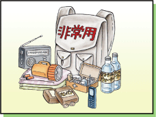 非常時持出品を準備しておきましょう。 ラジオや携帯電話などもわすれずに。 |