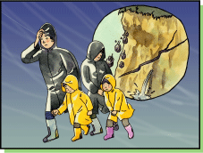 | 土砂災害の多くは雨が原因で起こりま す。 1時間に20ミリ以上、または降りはじめ から100ミリ以上の降雨量になったら、 十分な注意が必要です。 |