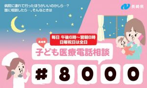県では、夜間や休日のお子さんの急な病気やケガ等の際、保護者の方々が対処に戸惑う時や医療機関を受診すべきか判断に迷ったときに、「家庭での対処方法」や「医療機関の受診の要否」について電話で相談に応じる「長崎県子ども医療電話相談センター」を開設しています。