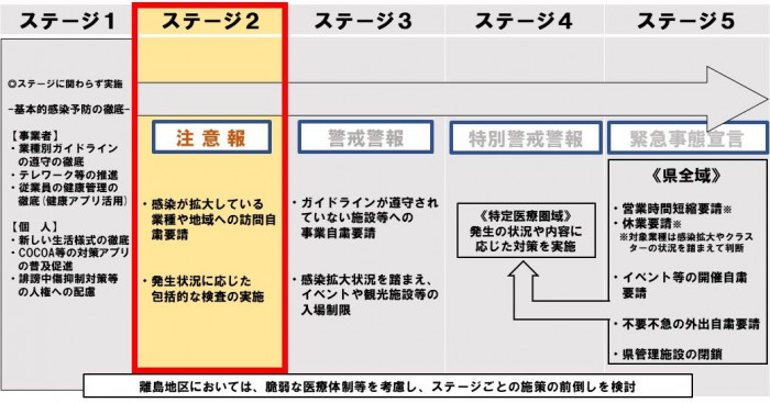 • 直近の感染状況を踏まえ、県全体の感染段階を【ステージ1】から【ステージ2】に移行するとともに県下全域に注意報を発令。