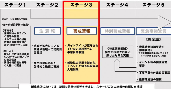 - 直近の感染状況を踏まえ、県全体の感染段階を【ステージ2】から【ステージ3】に移行するとともに県下全域に警戒警報を発令。