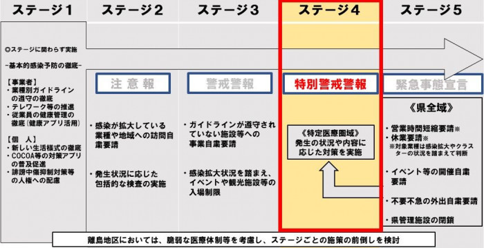 • 直近の感染状況を踏まえ、県全体の感染段階を【ステージ3】から【ステージ4】に移行するとともに県下全域に特別警戒警報を発令。