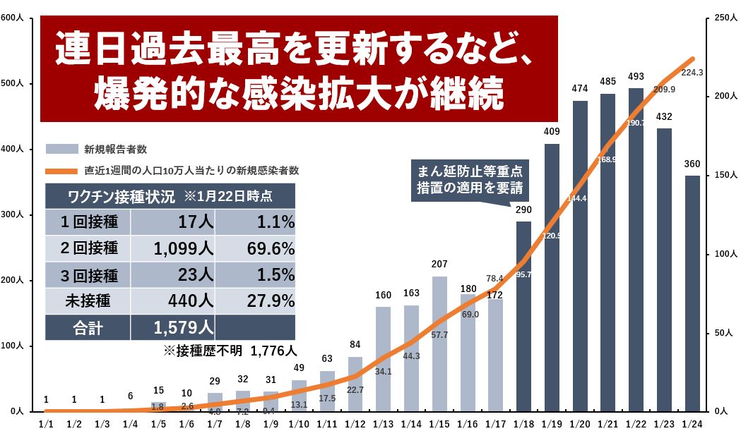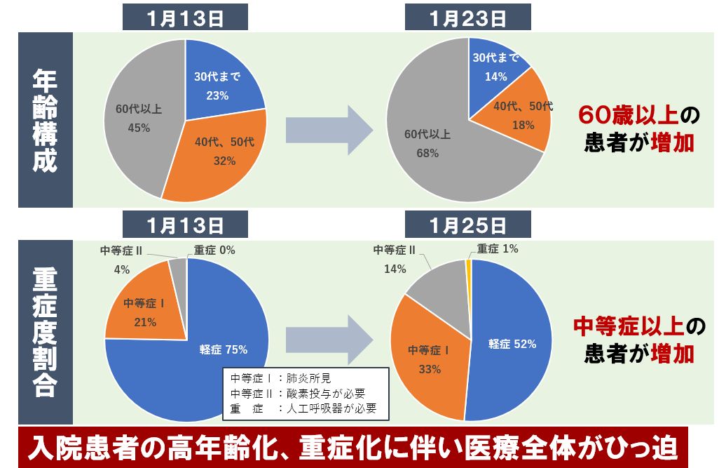 - 感染者の爆発的増加により、コロナ患者受入医療機関の医療従事者にも感染者(濃厚接触者)が確認されており、医療提供体制に支障が生じつつある
