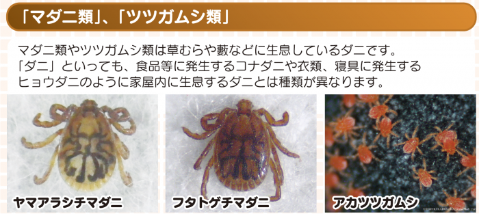 野外の藪や草むらに生息しているマダニ類やツツガムシ類は、日本紅斑熱や重症熱性血小板減少症候群(SFTS)、つつがむし病を媒介します。