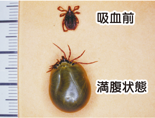 A :マダニは、長時間(数日から長いものは10日間以上)吸血します。吸血しているマダニに気がついた際、無理に引き抜こうとせず、皮ふ科等の医療機関で処置してもらいましょう。また、2週間程度は、体調の変化に注意をし、発熱等の症状が出た時は内科・皮ふ科等の医療機関で診察を受けてください。
