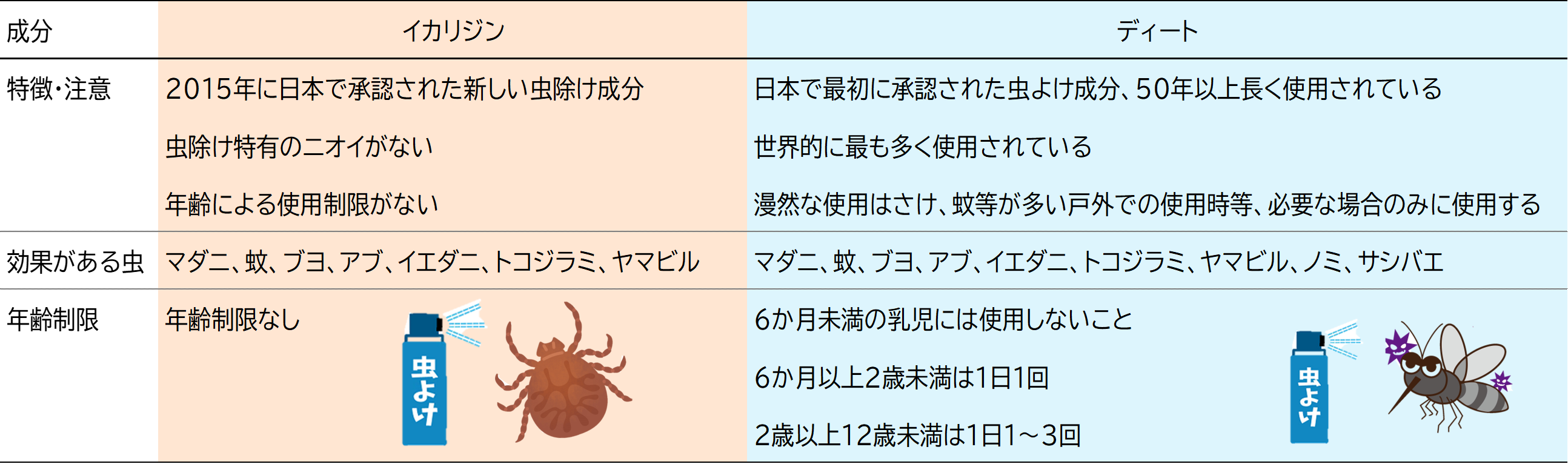 マダニに効果がある虫除けは2種類の成分があります。屋外活動時は、ご自身にあった商品を適切に使用しましょう。