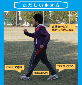 • 背筋を伸ばし、人に見られているような意識を持ちましょう。→ 姿勢の良い歩き方になります。