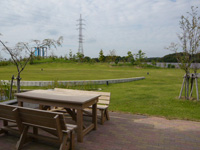 池の水は雨水を利用しています。水をきれいにする植物やメダカがいますよ。 写真のテーブルといすは、プラスチックを再生利用したものです。 (九州運輸機構(株)(時津町)製) インターロッキングブロックには、焼却ごみから作ったリサイクル資材が使われています。 ((株)マツヤ産業(長崎市)製) |