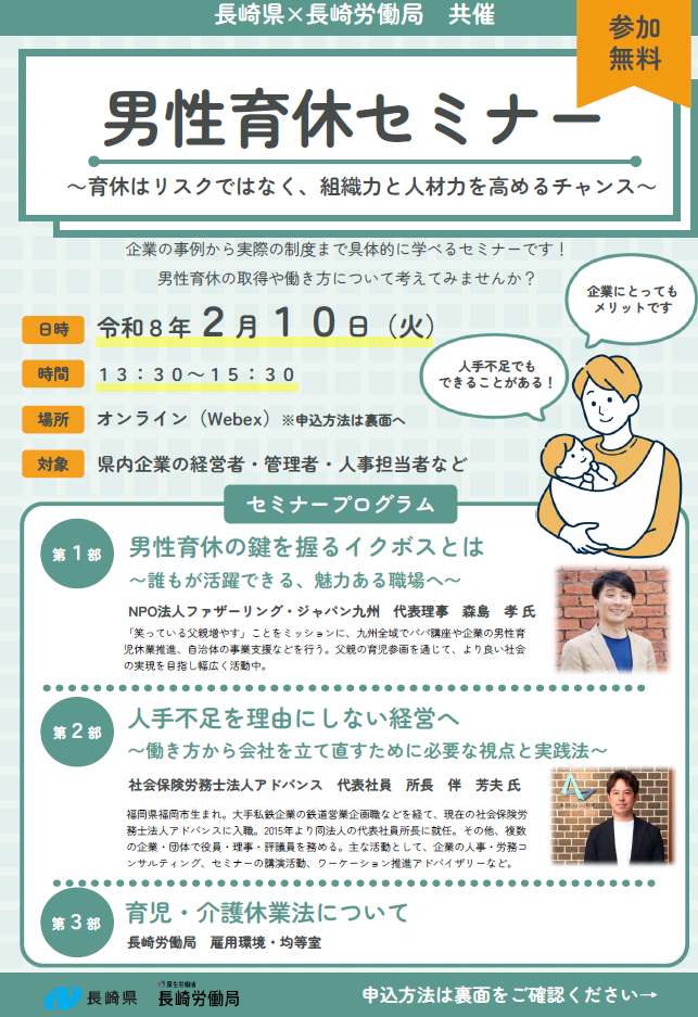 県では、長崎労働局と共催で、男性の育児休業取得促進・周知のために講師を招き、県内企業向けのセミナーを開催いたします。