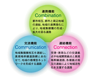 地域高規格道路は、高規格幹線道路と一体になって、地域発展の核となる都市圏、地域集積圏の育成や地域相互の交流促進、空港・港湾等の広域交通拠点との連絡等に貢献する道路として、地域の実情に応じた走行サービスを提供する役割を担っています。