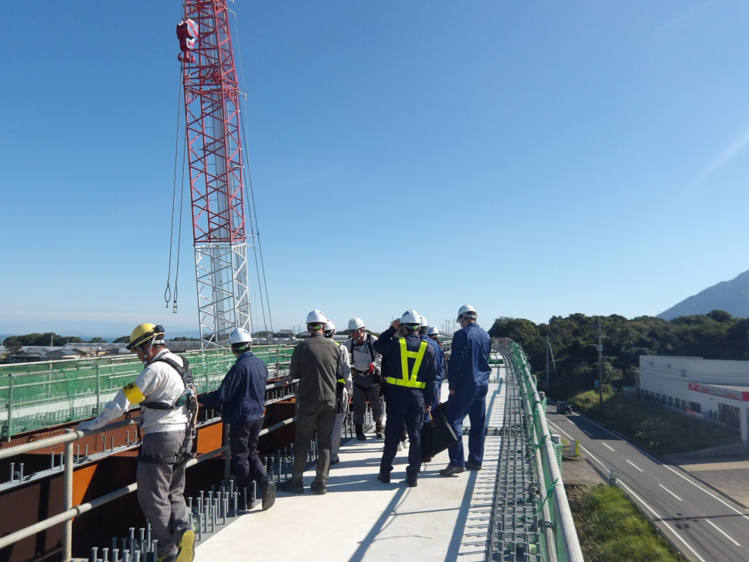 現場事務所で説明を受けた後、架設後の橋梁を見学しました。机上では得られない”現場ならでは”の気づきや考え方を得られたのではないでしょうか。
