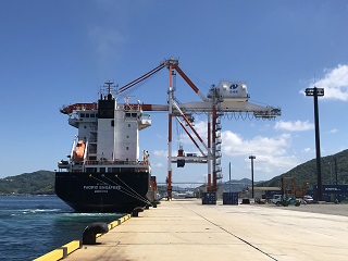 こちらの写真は長崎市小ヶ倉町に存在する公共外貿ふ頭のガントリークレーンがコンテナを吊っている様子を撮影したものです。こちらは現在、岸壁とふ頭用地を整備しています。