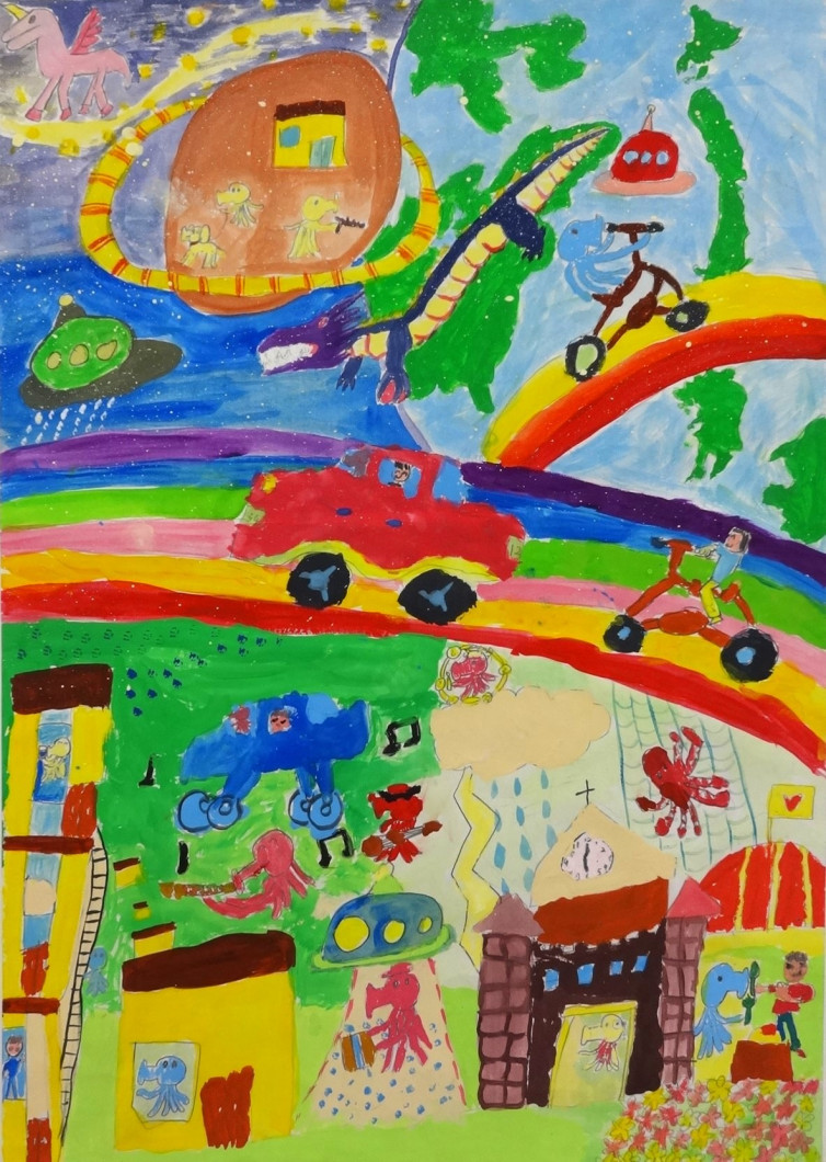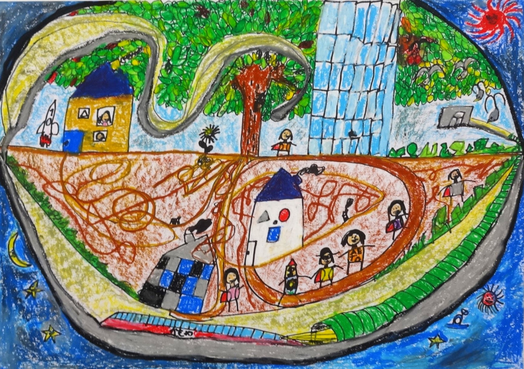 【審査員コメント】 ・真ん中に生えている大木の青々と茂り、一枚一枚ていねいに描かれた葉と対比するように、地中にうごめくように自由にのびている根っこ。宇宙に浮かぶ島なのか、新幹線のトンネルも画面の端からググっとのびてきているような様子や、大胆に水平線で画面を上下二分する構図、そしてその世界で楽しそうに暮らす人々がしっかりと描かれた面白い作品である。 ・細かい部分も丁寧に表されていてとても頑張って描いてくれたことがよく分かります。人と自然と科学とが、大きなつながりの中で調和して暮らしが営まれている様子を想像させてくれる、とてもスケールが大きな作品です。 ・カプセルの中で人が仲良く暮らしている様子が伝わってくる。かもめやスペースシャトルも描かれていて見るだけで楽しい。また葉っぱを一枚一枚丁寧に描かれているところも良い。 ・カプセルの中に作者が住んでみたい理想のまちが埋め込まれており、新幹線で、まちや森の中を縦横無尽に移動できる空間が楽しく描かれている。 |