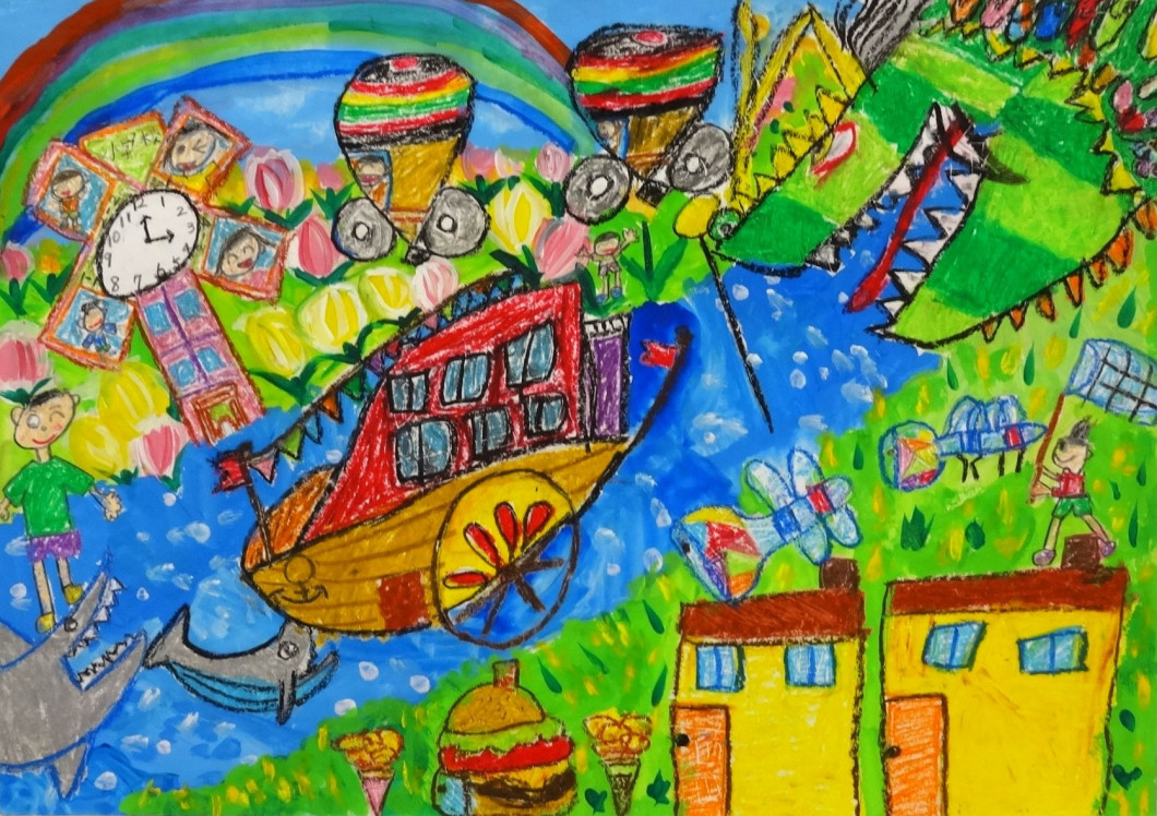 【審査員コメント】 ・まず色彩が素晴らしく、目を引く作品である。海が斜めに横切るように配置され、その波の立つ水の色と周囲の線との対比が見ていてとても心地良い。ハウステンボスの風車と学校が合体していたり、ビードロがトンボになって子どもたちが網でつかまえようとする様子、ハンバーガーやカステラの家など、アイデアもたくさん詰まった面白い作品である。 ・明るい色合いで元気あふれる絵です。カステラの家や佐世保独楽の車、風車が学校になっている様子など、見る人をワクワクさせるアイデアがたくさん詰まった、見ていて楽しくなる作品です。 ・長崎が大好き、ずっと暮らしていきたいという思いがあふれている。佐世保独楽の形をした車が走るなど自由な発想もおもしろい。 ・長崎県の名産物が乗り物や建物として描かれており、青い海と山と空が色鮮やかに表現され、長崎が大好きな作者の思いが伝わってくる。 |