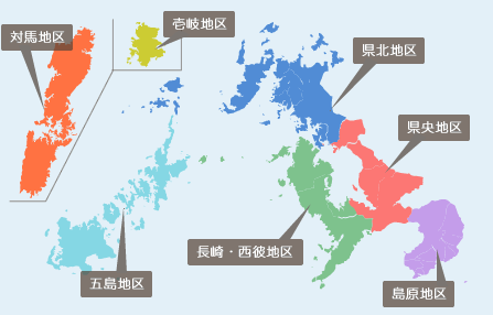 長崎・西彼地区、県央地区、島原地区、県北地区、五島地区、壱岐地区、対馬地区に、それぞれ移住におすすめの地域(集落)があります。
