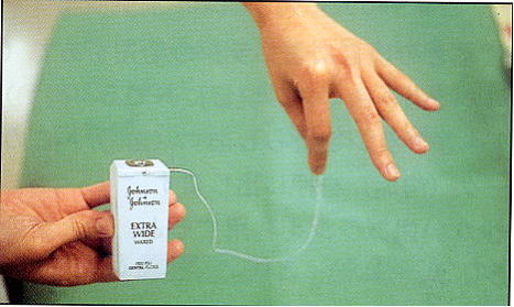 図2が歯間ブラシ,図3がデンタルフロスです。一般的には歯と歯の隙間が広い場合は歯間ブラシ,狭い場合はデンタルフロスを使いますが、他にもトゥースピック(歯科用三角ようじ)などの補助的清掃器具があります。歯間ブラシは超極細から極太(SSSからLLサイズまで)まで揃っていますので、隙間の大きさに合ったものを選んでください。デンタルフロスは歯と歯の間を通過しやすいように鑞を塗ってあるものもあります(ワックスタイプ)。