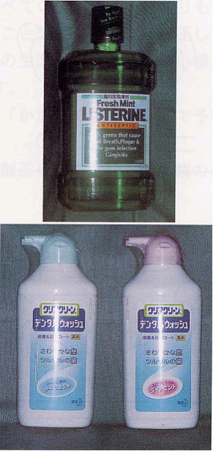 基本的には歯ブラシと補助的清掃用具を使用すればプラークコントロールは達成できるのですが、歯並びや手先の器用さ,歯垢(プラーク)の付着部位などにより、毎回は完全に除去できない部位もでてくるでしょう。そのような時、薬用の液状の洗口液が道具の届かない所にまで到達し、殺菌効果を発揮することが可能です。さらに口臭予防にも有効なため、若い女性を中心とした静かなブームになっています。使い方はいたって簡単です。説明書に従って、決められた時間、口をゆすいでください。現在、たくさんの洗口液(図4)が市販されていますが、配合されている薬の種類が異り、味も違うため、どれを選ぶべきかに苦慮するかも知れません。その選択は歯科医院で相談されることをお薦めします。