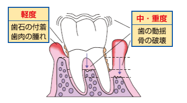 ・炎症が歯肉(歯ぐき)に限局されている程度は「歯肉炎」といい、歯肉だけでなく歯を支えている骨などまで炎症が進行すると「歯周炎」という状態になります。