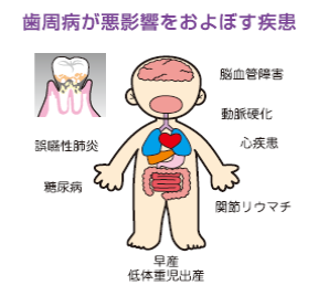 ・歯周病は生活習慣の改善により予防できる生活習慣病です。また、歯周病は、糖尿病、心疾患、誤嚥性肺炎、早産などの全身疾患との関連が多く報告されています。