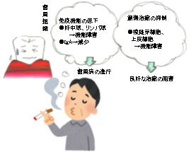 喫煙により免疫機能の低下、創傷治癒の抑制が起こり、歯周病が悪化していきます。口腔がんの危険因子でもあります。