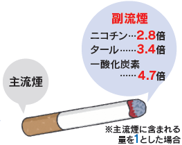 たばこの煙には喫煙者が直接吸い込む「主流煙」と、火のついた先から立ち上がる「副流煙」の2種類があります。周囲の人が影響を受ける副流煙は燃焼温度が低いため、有害物質の多くが分解されていません。またフィルターも通していないため、非常に危険な煙と言えます。