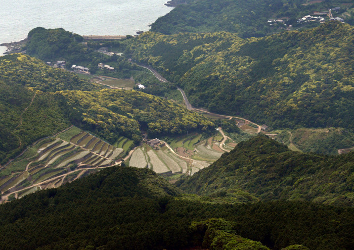 掲載の写真は春日集落を撮影した写真である。画面中央域に広がる美しい景観の棚田は江戸時代に開墾され、その右手端に聖地とされる丸尾山がある。この写真は海抜534メートルの安満岳山頂から撮影しているが、春日集落と棚田は海岸から同岳に向け急峻する急斜面にあることが見てとれる。尚、春日集落は世界文化遺産「長崎と天草地方の潜伏キリシタン関連遺産」の一構成遺産となっている。