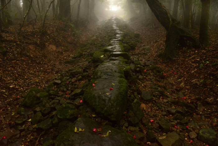 掲載の写真は安満岳の白山比賣神社の参道を撮影した作品である。春日集落や生月島の潜伏キリシタンたちはこの参道を登って同神社に参拝した後で、その裏手にある自然石積上げ祠の「奥の院」様にオラショを唱えていたと言われている。尚、安満岳は世界文化遺産「長崎と天草地方の潜伏キリシタン関連遺産」の一構成遺産となっている。