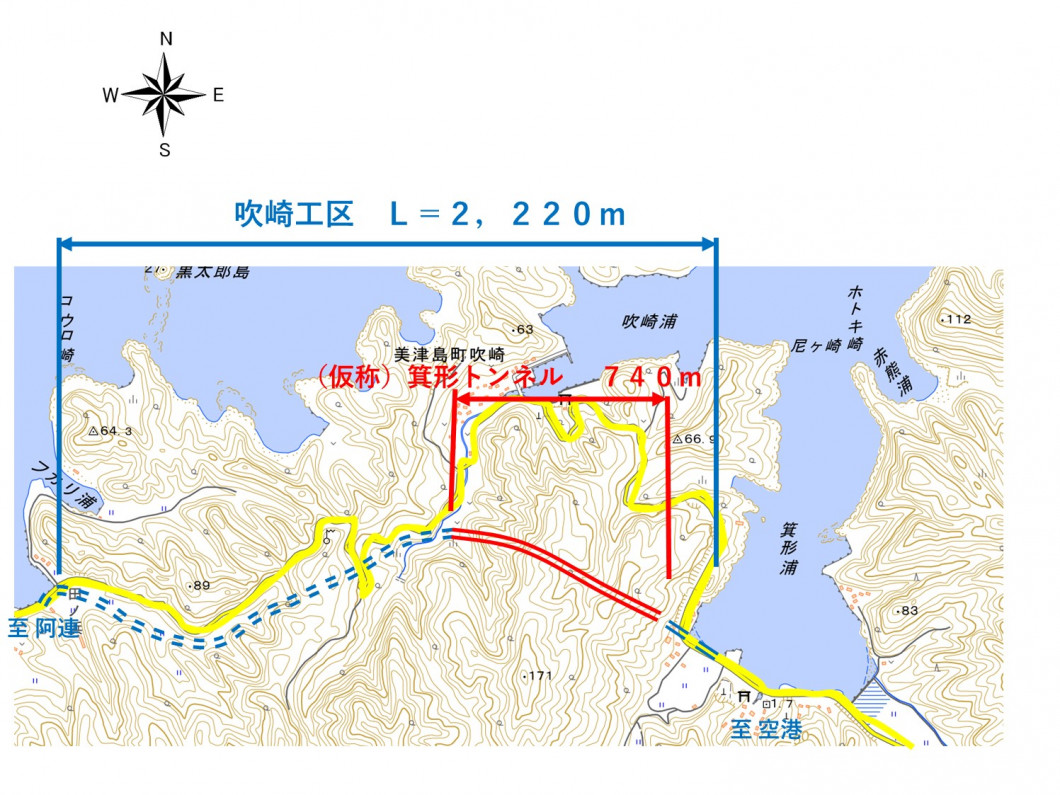 重要な幹線道路であります。トンネル整備区間である吹崎地区から箕形地区の現道は、幅員狭小で線形が悪く、急勾配で車両の離合が困難である