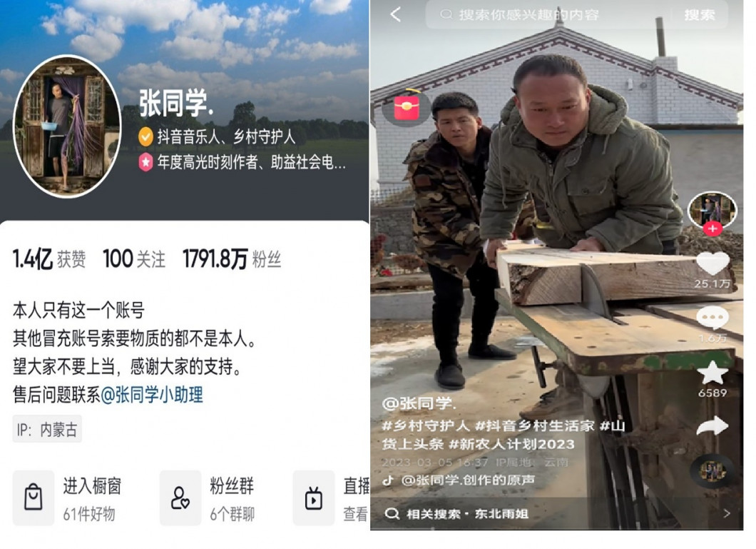 約1800万のフォロワーを持っている「張同学」の投稿内容は木で驢車(ろしゃ)を作ったり犬や鶏に餌をやるなど農家としての仕事、自分で料理を作ったり自宅を掃除したりなど、彼自身の日常生活の記録ですが、「抖音」では大人気で、トップインフルエンサーの一人にもなりました。