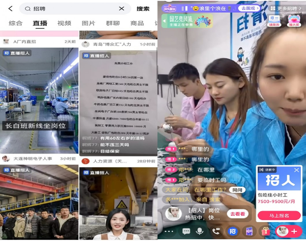 就職活動をより一歩応援する機能を開発したショート動画アプリもあります。「快手」が「快聘」(快手招聘、早く採用という意味も含めている)機能を開発しました。求人側が「快手」のライブ配信を利用して、工場の現場や仕事内容などを送信し、求職側が求人側と直接話ができ、ライブ配信のリンクをクリックして、簡単に応募できるようになりました。