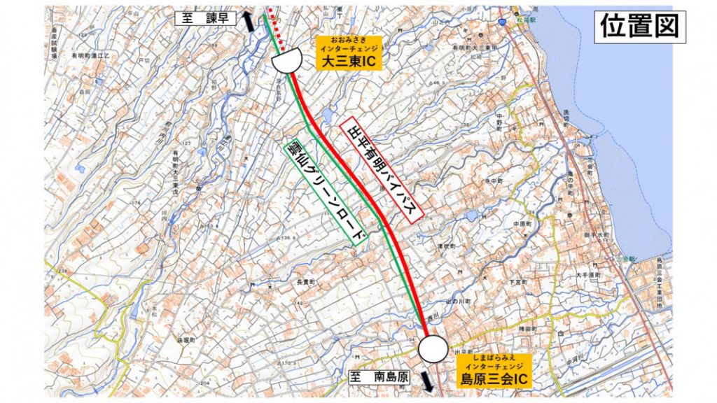 島原道路(出平有明バイパス)においてインターチェンジの名称が決定しました。 出平有明バイパス間におけるインターチェンジの名称が決定しました。早期完成に向けて、引き続き整備を行っていきますので 島原道路建設にご理解とご協力のほどよろしくお願いいたします。 位置図