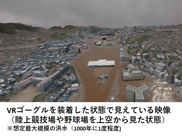 県市だけでなく、自衛隊や消防、ライフライン事業者、気象台、社会福祉協議会、防災士会等が参加するなかで、私たちはVR空間内で浦上川の流域における浸水体験ができるコーナーを担当しました。想定される最大規模の降雨(24時間雨量1040mm、長崎大水害の約2倍)で浦上川が氾濫した場合に、市街地周辺で浸水が想定される状況を体験するものです。