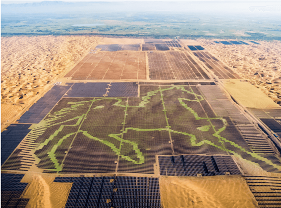 (内モンゴル自治区クブチ砂漠の太陽光発電パスワード、元一エネルギー網より[1])