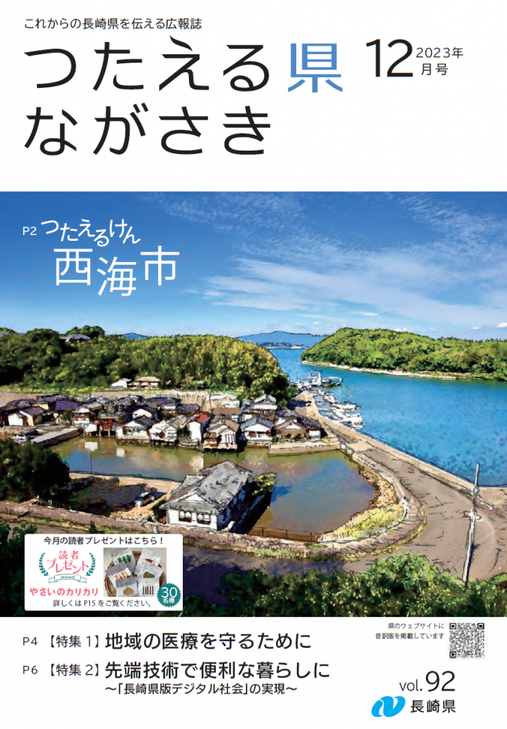 プレゼントの応募はこちらをクリック新しいウィンドウで開きます デジタルブック(電子書籍版)はこちらをクリック(外部リンク)新しいウィンドウで開きます 全ページ つたえる県ながさき12月号(16ページ)[PDFファイル/6MB] 表紙 つたえる県ながさき12月号表紙[PDFファイル/898KB] つたえるけん 西海市 つたえる県ながさき12月号つたえるけん(2ページから3ページ)[PDFファイル/2MB] 特集 地域の医療を守るために つたえる県ながさき12月号特集(4ページから5ページ)[PDFファイル/1MB] 先端技術で便利な暮らしに ~「長崎県版デジタル社会」の実現~ つたえる県ながさき12月号特集(6ページから7ページ)[PDFファイル/955KB] つたエールけん BugsWell株式会社 つたえる県ながさき12月号つたエールけん(8ページ)[PDFファイル/842KB] すすめるけん 一人で悩まず、消費生活センターに早めの相談を! つたえる県ながさき12月号すすめるけん(9ページ)[PDFファイル/929KB] 県政トピックス 中学生が実感!英語で広がる世界と可能性 長崎空港から上海、そして世界へ! つたえる県ながさき12月号県政トピックス(10ページ)[PDFファイル/459KB] ながさきレシピ、すくすくいきいき ミニトマトとシーフードのバジル炒め HIVの無料検査を受けましょう ~12月1日は世界エイズデーです~ つたえる県ながさき12月号ながさきレシピ、すくすくいきいき(11ページ)[PDFファイル/796KB] 情報ひろば つたえる県ながさき12月号情報ひろば(12ページから14ページ)[PDFファイル/1MB] 読者プレゼントなど 「#長崎の米風景」フォトコンテスト開催中! つたえる県ながさき12月号読者プレゼントなど(15ページ)[PDFファイル/1MB] 裏表紙 地域の特色ある文化・芸術【西海市】 つたえる県ながさき12月号裏表紙[PDFファイル/751KB]