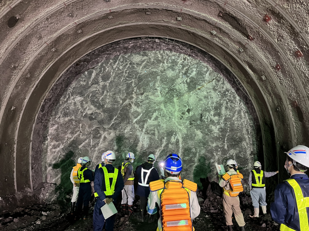 工事概要の説明を聞いた後、トンネル内を実際に見学しました。施工業者の方々と工事の状況や施工方法に関することなど活発な意見交換が行われました。