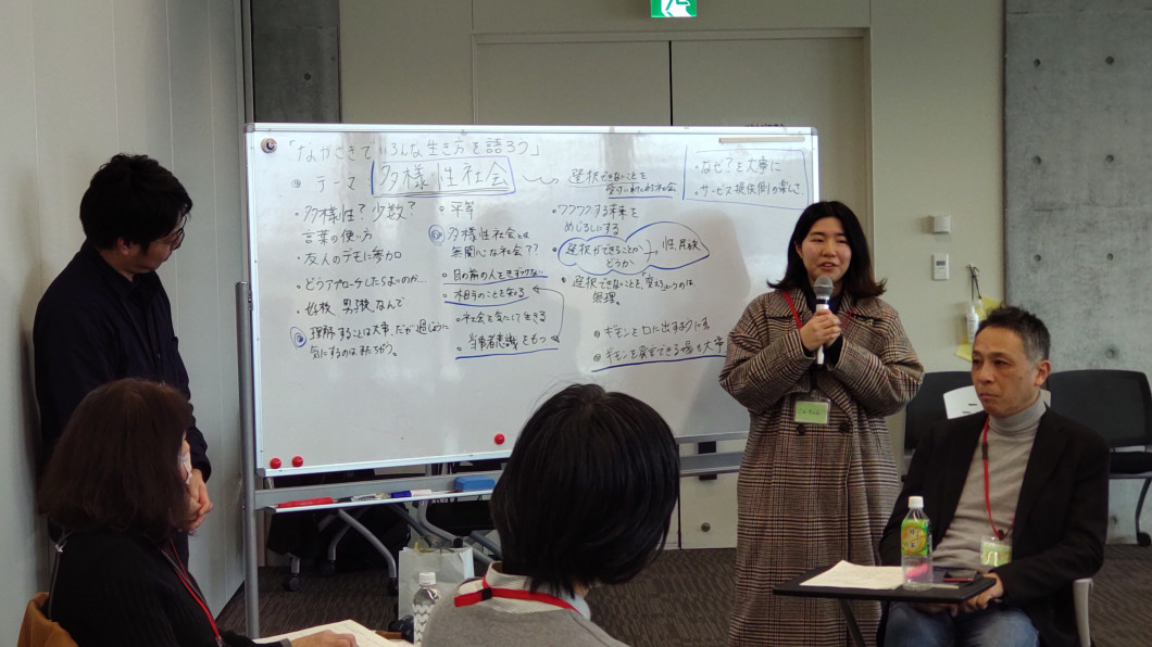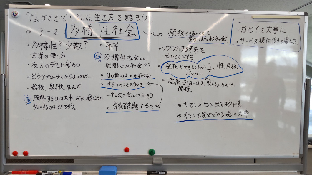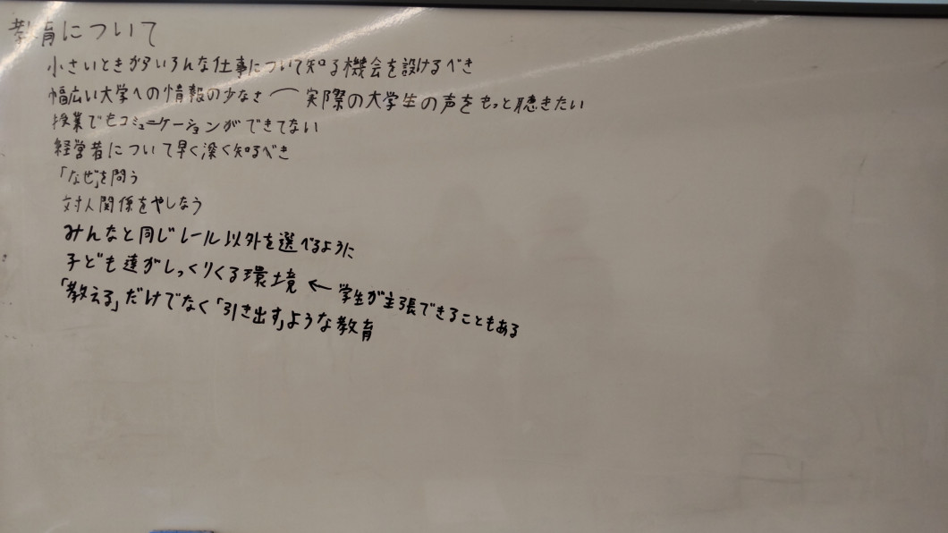 • 様々な方がいて、様々な考え方があるのだと思いました。そのような意見を聞いていくなかで多くの考えを思いつくことができたので良かったです。一人で考えるだけでなくこのように交流することで考えの幅が広がると思いました。このような経験はなかなかできないので、このような場所がもっと増えるべきだと感じました。