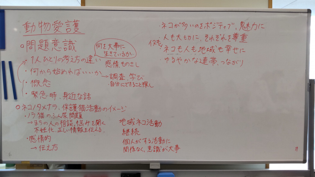子ども(教育)・動物愛護・多様性社会の3グループに分かれ、自己紹介の後、各分野における課題などを出し合って、その解決を図るにあたって自分が何をしていくべきか(どう生きていくか)などについて意見交換を行いました。最後に各チームで話し合った結果を発表し、全体で共有しました。なお、ファシリテーションやホワイトボードへの記録については「学生×NPOであたびProject」の参加大学生が行いました。 発表後、訪問先NPO及び講師からコメントをいただきました。