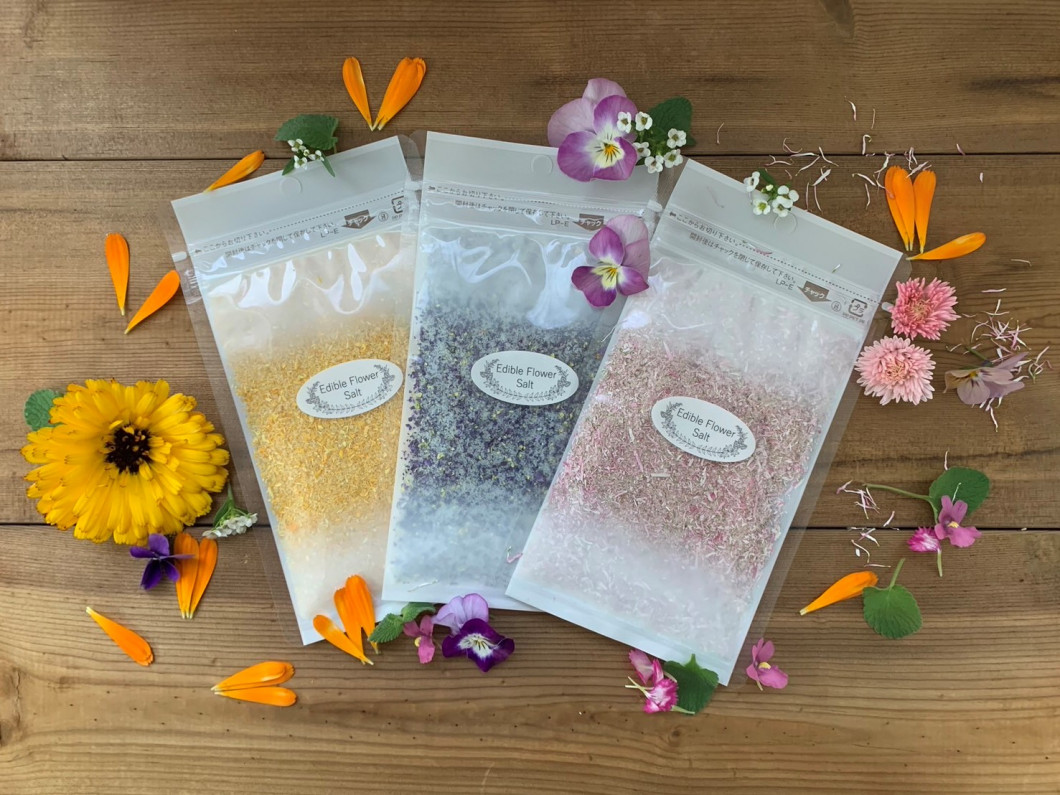 エディブルフラワーの花びらを乾燥させ、平戸産の塩とブレンドして作られた食卓に彩りを添える一品。魚やお肉、天ぷらの付け塩、サラダや料理の仕上げにお使いください。
