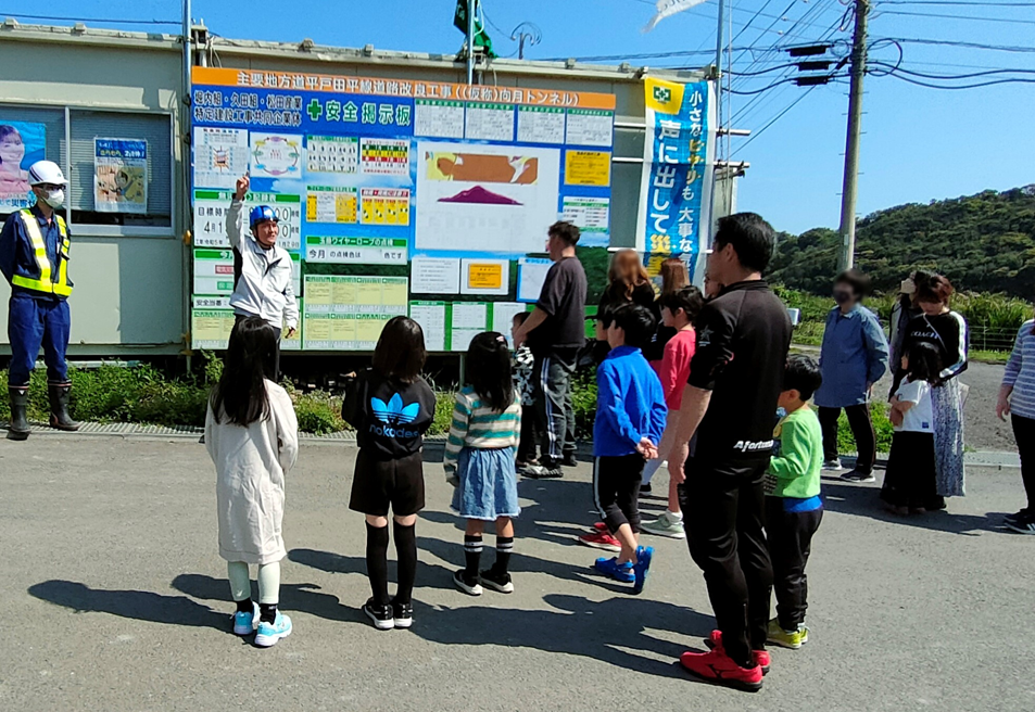 現場見学会 主要地方道平戸田平線道路改良工事((仮称)向月トンネル)において、親と子の現場見学会を開催しました。 概要 日時:令和6年4月13日(日曜日) 場所:主要地方道平戸田平線道路改良工事((仮称)向月トンネル) 工事現場(平戸市野子町) 施工業者:堀内組・久田組・松田産業 特定建設工事共同企業体 参加人数:保護者+子供合わせて27名 見学会の様子