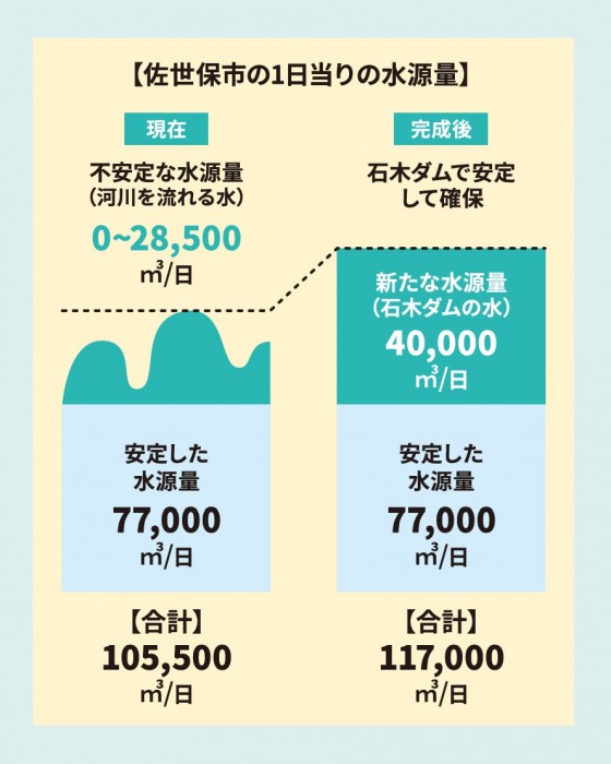 県が佐世保市(旧佐世保市)に許可している水利権量は1日あたり77,000立方メートルです。