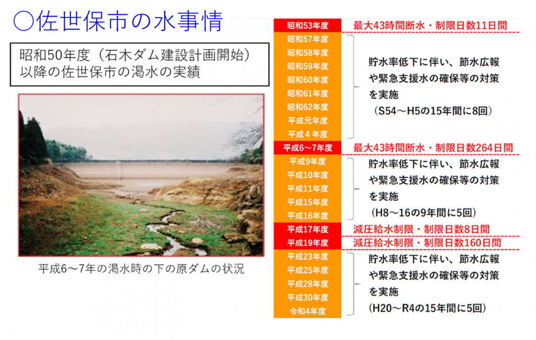また、佐世保市では、平成6年以降も2度の給水制限(減圧)が行われており、これまで平均して約2年に一度、給水制限や渇水対策本部の設置など、渇水の危機に瀕しています。異常気象の進行を鑑みれば、今後、いつ大きな渇水が起きないとも限らないと考えています。