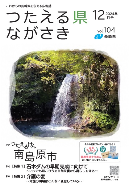 プレゼントの応募はこちらをクリック デジタルブック(電子書籍版)はこちらをクリック(外部リンク)新しいウィンドウで開きます 全ページ つたえる県ながさき12月号(16ページ)[PDFファイル/9MB] 表紙 つたえる県ながさき12月号表紙[PDFファイル/843KB] つたえるけん 南島原市 つたえる県ながさき12月号つたえるけん(2ページから3ページ)[PDFファイル/2MB] 特集 石木ダムの早期完成に向けて~いつでも起こりうる自然災害から暮らしを守る~ つたえる県ながさき12月号特集(4ページから5ページ)[PDFファイル/819KB] 介護の変~介護の現場はこんなに変化している~ つたえる県ながさき12月号特集(6ページから7ページ)[PDFファイル/569KB] 県政トピックス パリ2024オリンピック柔道男子代表 永瀬貴規選手に県民栄誉賞特別賞 日本スポーツマスターズ2024長崎大会 第1回ながさきブランド構築プロジェクト 県庁・民間若手職員ワーキング会議を開催 つたえる県ながさき12月号県政トピックス(8ページから9ページ)[PDFファイル/1MB] つたエールけん 株式会社高田牧場 つたえる県ながさき12月号つたエールけん(10ページ)[PDFファイル/690KB] ながさきレシピ、すくすくいきいき 焼きそうめん ココロンパスポートはお持ちですか? つたえる県ながさき12月号ながさきレシピ、すくすくいきいき(11ページ)[PDFファイル/830KB] 情報ひろば つたえる県ながさき12月号情報ひろば(12ページから14ページ)[PDFファイル/878KB] 読者プレゼントなど スタンプラリー「ながさき照らす旅」を開催中! つたえる県ながさき12月号読者プレゼントなど(15ページ)[PDFファイル/1MB] 裏表紙 地域の特色ある文化・芸術【南島原市】 つたえる県ながさき12月号裏表紙[PDFファイル/637KB]