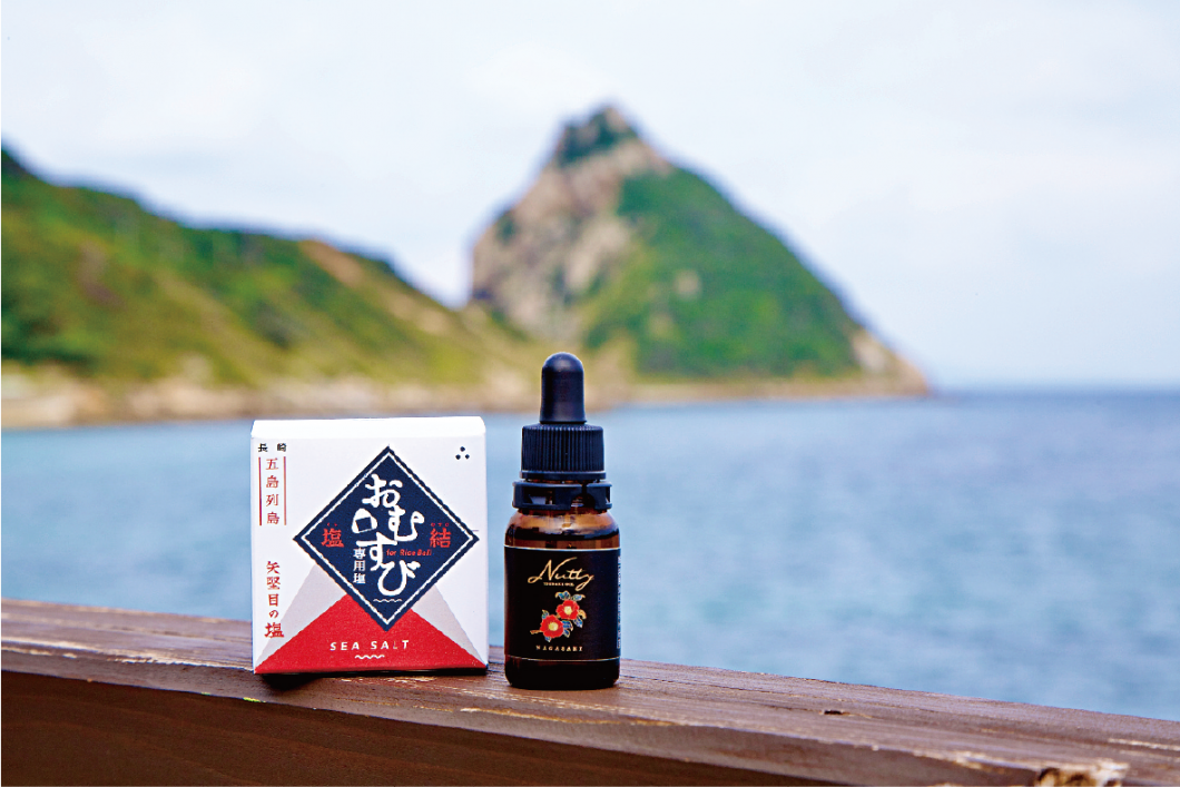 ごはんに合うように2種類の塩を独自のバランスで配合したおむすび専用塩「塩結(えんむすび)」と、五島列島に自生するヤブ椿のみを使用した生搾りの天然椿油100%オイル「Nutty(ナッティ)」をセットでお届けします。ぜひご賞味ください。