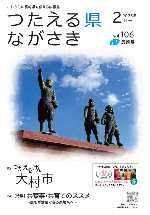 「つたえる県ながさき」第106号(令和7年2月号) プレゼントの応募はこちらをクリック デジタルブック(電子書籍版)はこちらをクリック(外部リンク)新しいウィンドウで開きます 全ページ つたえる県ながさき2月号(16ページ)[PDFファイル/7MB] 表紙 つたえる県ながさき2月号表紙[PDFファイル/887KB] つたえるけん 大村市 つたえる県ながさき2月号つたえるけん(2ページから3ページ)[PDFファイル/2MB] 特集 共家事・共育てのススメ つたえる県ながさき2月号特集(4ページから7ページ)[PDFファイル/2MB] つたエールけん 株式会社ナカムラ消防化学 つたえる県ながさき2月号つたエールけん(8ページ)[PDFファイル/1MB] すすめるけん 消防団で活動しよう! つたえる県ながさき2月号すすめるけん(9ページ)[PDFファイル/2MB] 県政トピックス ながさき「しま」のビジネスチャレンジ2024を開催 長崎デザインアワード2024 受賞商品を表彰 つたえる県ながさき2月号県政トピックス(10ページ)[PDFファイル/443KB] ながさきレシピ、すくすくいきいき ニンジンとサツマイモのバターソテー 2月1日は「フレイルの日」です つたえる県ながさき2月号ながさきレシピ、すくすくいきいき(11ページ)[PDFファイル/810KB] 情報ひろば つたえる県ながさき2月号情報ひろば(12ページから14ページ)[PDFファイル/667KB] 読者プレゼントなど 県公式LINEお友だち25,000人突破記念プレゼントキャンペーン開催中! つたえる県ながさき2月号読者プレゼントなど(15ページ)[PDFファイル/1MB] 裏表紙 地域の特色ある文化・芸術【大村市】 つたえる県ながさき2月号裏表紙[PDFファイル/979KB] カテゴリー 分類 県政情報 広報 広報誌・情報誌・パンフレット 広報誌バックナンバー(令和6年度) このページを見ている人はこんなページも見ています