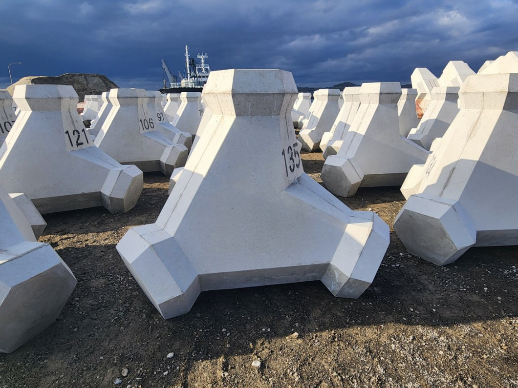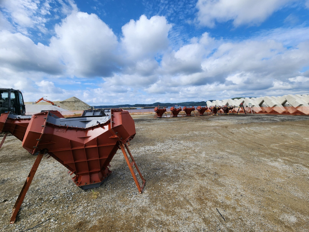 令和6年度も継続して工事を実施しており、令和6年10月初旬から工事に着手し、郷ノ浦港鎌崎地区ヤードにて令和6年10月中旬に消波ブロックの型枠組立を完了、それ以降令和6年12月下旬まで合計142個の消波ブロック(クリンガー2t型)の製作を行いました。これから海上の状況を見ながら令和7年1月末から令和7年2月上旬頃にかけて据付作業を実施します。