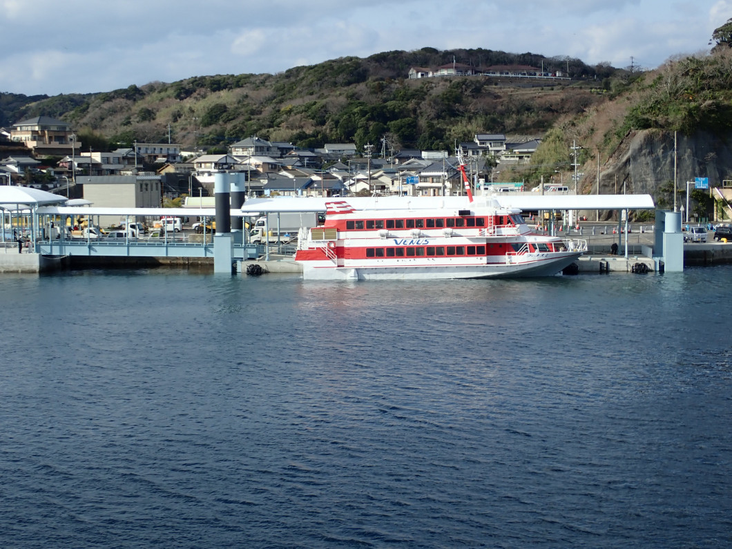 これまでは岸壁からJFへ乗り降りをしており、潮位によって乗り降りしづらい時もありましたが、浮桟橋の整備により、快適に乗り降りが出来るようになります。また、九州郵船(株)の方でも操船訓練を行いまして、JFが安全に浮桟橋へ離着船出来るかと、旅客の乗降時の安全性を確認して問題ありませんでした。令和7年4月1日の郷ノ浦港発着便(9:10着、9:25発)より供用予定ですので、是非ご利用してみてください。なお、お見送りの方は灰色のカラー舗装のところからお願いします。