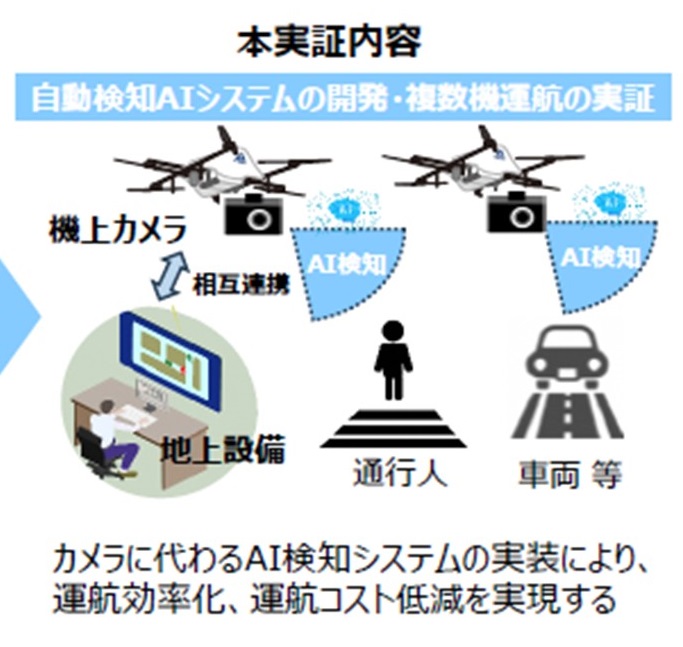 - ドローンのレベル3.5飛行は、機体に搭載したカメラからの映像を地上において人がモニター監視するなどの安全対策を講じながら飛行する必要があるが、自動検知AIシステムを用いた第三者の立入り検知やオペレーターへの通知についての有効性検証等を行ったもの。