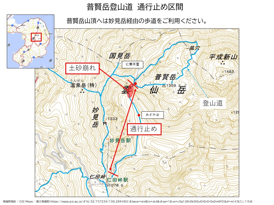 大雨被害に伴い、土砂崩れが発生したため通行止めにしております。 令和7年8月11日未明からの大雨により、普賢岳登山道で土砂崩れが発生しています。以下の一部の区間が通行止めになっています。普賢岳山頂へは妙見岳経由の歩道をご利用ください。 紅葉茶屋~あざみ谷~仁田峠