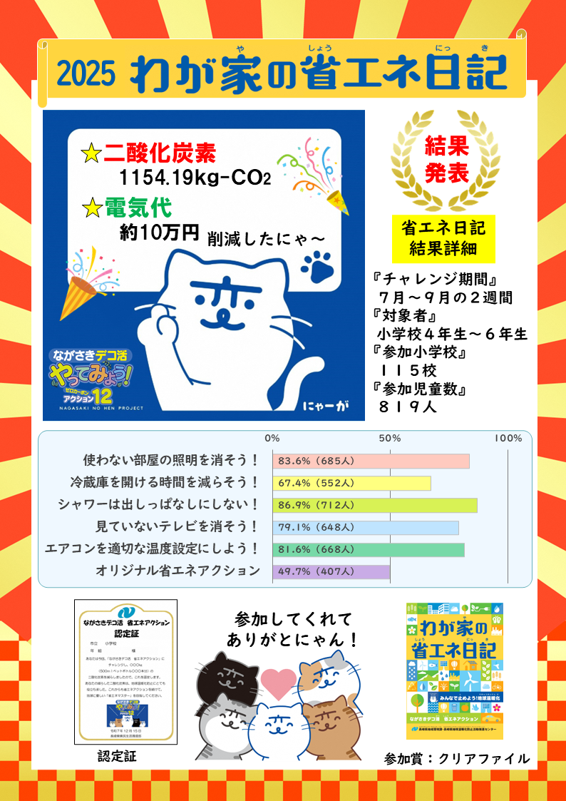 令和7年度は、115校819名の児童が省エネアクションに取り組み、1,154.19kg-CO2の二酸化炭素排出量が削減されました。